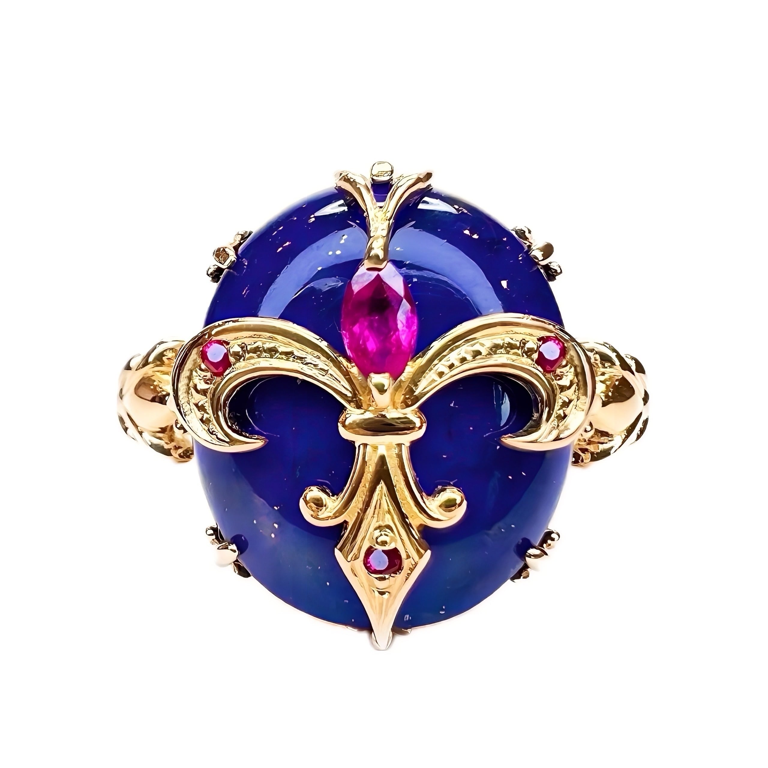 百合モチーフ、そしてファンシーカットのルビーがセッティングされており、上品で美しいデザインリングとなっております。
