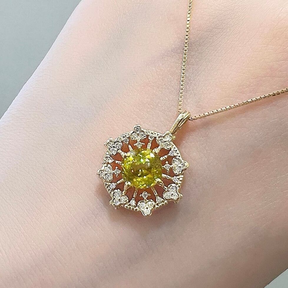 クラシカルで透かし感のあるレース調のデザインにピッタリなスフェーンは色の中から輝きが強く、イエローゴールドカラーと組み合わさり上品な華やかさを引き立てます✨️